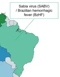 Brazilian hemorrhagic fever (BzHF) is an infectious disease caused by Brazilian mammarenavirus, an arenavirus.[5] Brazilian mammarenavirus is one of the arenaviruses from South America to cause hemorrhagic fever.[6] It shares a common progenitor with Argentinian mammarenavirus, Machupo mammarenavirus, Tacaribe mammarenavirus, and Guanarito mammarenavirus.[6] It is an enveloped RNA virus and is highly infectious and lethal.[7] Very little is known about this disease, but it is thought to be transmitted by the excreta of rodents.[5][7] This virus has also been implicated as a means for bioterrorism, as it can be spread through aerosols.[8]
