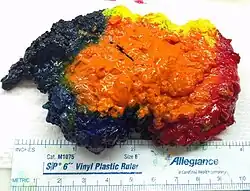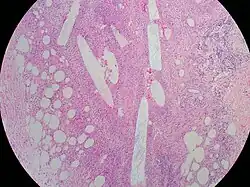 Excisional biopsy involves surgically removing the suspicious area of the breast to examine it under the microscope for diagnosis. One method is wire-guided (or wire-localized) excisional biopsy, where a wire is inserted into the breast and repeatedly imaged using breast ultrasound or mammography until the technician sees that the tip is located in the suspicious area. The suspicious area is then removed entirely in one block by the surgeon with the help of the wire.[10][20] When the tissue is removed, it is processed by a pathologist, who describes the tissue as it appears by eye and inks the sides to help orient the tissue under the microscope after it is sliced.[10] Each color corresponds to a direction, such as superior, inferior, medial, lateral, anterior, and posterior (these correspond to top, bottom, outside, inside, front, and back).[10] When the tissue is then looked at under the microscope, the margins can be evaluated to see if they are free of cancer cells, or if the surgeon needs to go back and remove more tissue from that area.[10] Titanium surgical clips are often left behind by surgeons to help future physicians locate the site and monitor for future disease or target the area with radiation if needed.[10] Percutaneous ("through the skin") biopsy methods have become more favored over surgical biopsies due to the high rate of benign findings (80%) and the reduction of adverse effects such as scarring.[11]