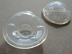 Breast shells are hollow, lightweight plastic disks worn inside the brassiere to help correct flat or inverted nipples either in preparation for or during breastfeeding. Also known as milk cups, breast cups, breast shields, or Woolwich shields, they can also be used to ease sensitive nipples or collect milk when the baby has not finished the teat.[1] Breast shells function by applying gentle but firm pressure to the region surrounding the nipple to stretch underlying adhesions and draw out the nipple.[2] Nipple shields may be confused with breast shells, but shields are intended for use during the act of breastfeeding, whereas breast shells are worn in preparation for or after breastfeeding.