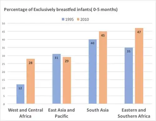WHO infant feeding recommendation states infants should be breastfed exclusively for the first six months of life to achieve optimal growth, development and health.[62] Exclusive breastfeeding (EBF) refers to the practice of feeding an infant on breastmilk alone for the first six months of life, without supplementing it with other food or even water.[63][64] According to WHO and UNICEF, mothers should initiate breastfeeding within the first hour after birth. Thereafter, exclusive breastfeeding should be continued for at least the first six months of life before the introduction of supplementary feeding.[65] Exclusively breastfed infants can only take oral rehydration solution, vitamins and minerals, and prescribed medications.[65] Scientific studies carried out by WHO and UNICEF have shown that both the mother and the child benefit from breastfeeding.[66] Breastfeeding is a cost-effective intervention that reduces the infant mortality and morbidity by lowering the risk of sickness from acute and chronic infections.[65] Prevalence of EBF increased in almost all regions in the developing world, from 1995 to 2010.[67] The biggest improvement can be seen in the West and Central Africa where the prevalence of EBF is more than doubled from 12% in 1995 to 28% in 2010. Southern and Eastern Africa also shows improvements with an increase from 35% in 1995 to 47% in 2010.[67] However, according to the UNICEF, there are no satisfactory changes in the EBF rates for the first six months since 1990. In order to provide breastfeeding support, WHO and UNICEF have developed two feeding programs, i.e.the 40-hour breastfeeding counseling, and the five-day infant and young child feeding counselling.[68][69] Furthermore, Yılmaz, Elif et al.,[70] in their clinical investigation report states, despite all the recommendations of the WHO, the rates of breastfeeding initiation and duration are still far from expectations worldwide.