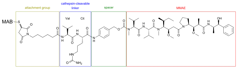 - ↑ 15.0 15.1 Francisco JA, Cerveny CG, Meyer DL, Mixan BJ, Klussman K, Chace DF, et al. (August 2003). "cAC10-vcMMAE, an anti-CD30-monomethyl auristatin E conjugate with potent and selective antitumor activity". Blood. 102 (4): 1458–65. doi:10.1182/blood-2003-01-0039. PMID 12714494.