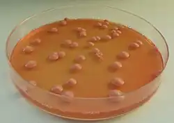 | Colonies of yeast Brettanomyces bruxellensis on agar plates containing phloxine B | |