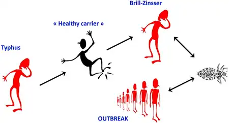Brill–Zinsser disease is a delayed relapse of epidemic typhus, caused by Rickettsia prowazekii. After a patient contracts epidemic typhus from the fecal matter of an infected louse (Pediculus humanus), the rickettsia can remain latent and reactivate months or years later, with symptoms similar to or even identical to the original attack of typhus, including a maculopapularrash.[2] At such times, typhus can be transmitted to other individuals through fecal matter of the louse vector, and generate a new epidemic of the disease.