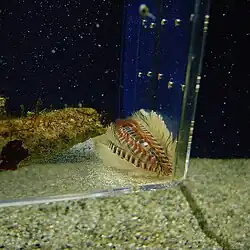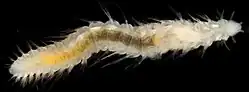 Amphinomidae, also known as the fireworms, bristle worms or sea mice,[2] are a family of marine polychaetes, many species of which bear chaetae mineralized with carbonate.[3] The best-known amphinomids are the fireworms, which can cause great pain if their toxin-coated chaetae are touched or trodden on.[4] Their relationship to other polychaete groups is somewhat poorly resolved.[4]