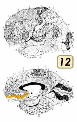 Brodmann area 12 is a subdivision of the cerebral cortex of the guenon defined on the basis of cytoarchitecture.[1][2] It occupies the most rostral portion of the frontal lobe. Brodmann-1909 did not regard it as homologous, either topographically or cytoarchitecturally, to rostral area 12 of the human. Distinctive features (Brodmann-1905): a quite distinct internal granular layer (IV) separates slender pyramidal cells of the external pyramidal layer (III) and the internal pyramidal layer (V); the multiform layer (VI) is expanded, contains widely dispersed spindle cells and merges gradually with the underlying cortical white matter; all cells, including the pyramidal cells of the external and internal pyramidal layers are inordinately small; the internal pyramidal layer (V) also contains spindle cells in groups of two to five located close to its border with the internal granular layer (IV).