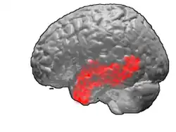 BA 21 is a higher-order visual association cortex with medium myelin content.[1] As a lateral temporal region, it is likely to play a part in auditory processing and language. Language function is left lateralized in most individuals.