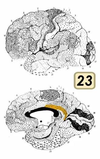 ![]() Medial surface of human brain. BA23 is shown in green. | |