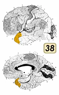 Brodmann area 38, also BA38 or temporopolar area 38 (H), is part of the temporal cortex in the human brain. BA 38 is at the anterior end of the temporal lobe, known as the temporal pole.