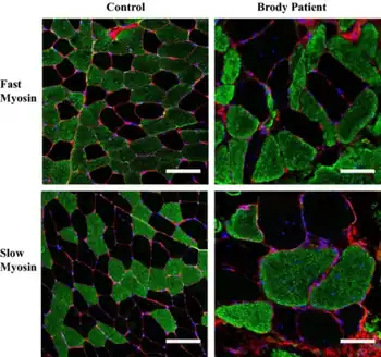 - ↑ McKusick, Victor; O'Neill, Marla (2017-12-27). "OMIM Entry - # 601003 - BRODY MYOPATHY". www.omim.org. Archived from the original on 2020-02-15. Retrieved 2018-09-25.