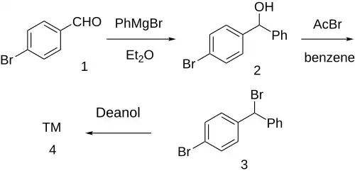 Grignard reaction between phenylmagnesium bromide and para-bromobenzaldehyde [1122-91-4] (1) gives p-bromobenzhydrol [29334-16-5] (2). Halogenation with acetyl bromide in benzene solvent gives p-bromo-benzhydrylbromide [18066-89-2] (3). Finally, etherification with deanol completed the synthesis of Bromazine (4).