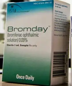 Bromfenac is a nonsteroidal anti-inflammatory drug (NSAID) which is used for pain and inflammation after cataract surgery.[1] It is used as an eye drop twice per day for two weeks.[1]