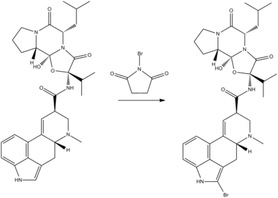Bromocriptine is a semisynthetic derivative of a natural ergot alkaloid, ergocryptine (a derivative of lysergic acid), which is synthesized by bromination of ergocryptine using N-bromosuccinimide.[32][33]
