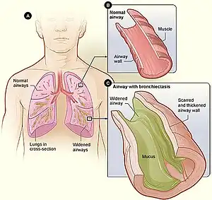 - ↑ 5.0 5.1 "What Is Bronchiectasis?". NHLBI. June 2, 2014. Archived from the original on 10 August 2016. Retrieved 10 August 2016.