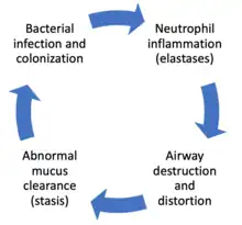 The "vicious cycle" theory is the generally accepted explanation for the pathogenesis of bronchiectasis.[60] In this model, a predisposed individual develops an excessive inflammatory response to pulmonary infection or tissue injury. The inflammation that results is partially responsible for the structural damage to the airways. The structural abnormalities allow for the stasis of mucus, which favors continued chronic infection and the persistence of the vicious cycle.[3]