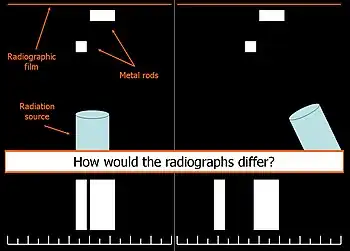 In 1909, Charles A. Clark described a radiographic procedure for localizing impacted teeth to determining their relative antero-posterior position.[1] If the two teeth (or, by extension, any two objects, such as a tooth and a foreign object) are located in front of one another relative to the x-ray beam, they will appear superimposed on one another on a dental radiograph, but it will be impossible to know which one is in front of the other. To determine which is in front and which is behind, Clark proposed his SLOB rule, as a complicated set of three radiographs, but which can be simplified as follows using just two: