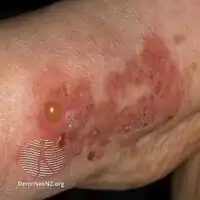 - ↑ Cozzani E, Gasparini G, Burlando M, Drago F, Parodi A (May 2015). "Atypical presentations of bullous pemphigoid: Clinical and immunopathological aspects". Autoimmunity Reviews. 14 (5): 438–45. doi:10.1016/j.autrev.2015.01.006. PMID 25617817.