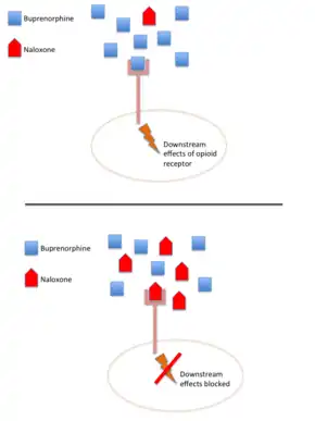 Buprenorphine, at lower doses, results in the usual opioid effects; however, high doses beyond a certain level do not result in greater effects.[7] This is believed to result in a lower risk of overdose than some other opioids.[7] Naloxone is an opioid antagonist that competes with and blocks the effect of other opioids (including buprenorphine) if given by injection.[4] Naloxone is poorly absorbed when taken by mouth and it is added to decrease the risk that people will misuse the medication by injection.[1] Misuse by injection or use in the nose, however, still occurs.[4] Rates of misuse in the United States appear to be lower than with other opioids.[8]