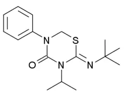 Buprofezin is an insecticide used for control of insect pests such as mealybugs, leafhoppers and whitefly on vegetable crops. It is a growth regulator, acting as an inhibitor of chitin synthase (IRAC group 16).[2] It is banned in some countries due to its negative environmental impacts, being especially toxic to aquatic organisms as well as non-target insects, though is of low toxicity to humans and other mammals.[3]