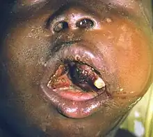 Seven-year-old Nigerian boy with a several-month history of jaw swelling which had been treated with antibiotics: The tumor was ulcerated and draining.