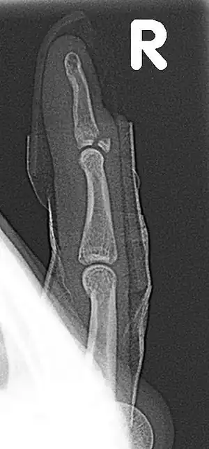 It is common in motorcycle riders and soccer joggers, caused by hyperflexion when the tendon is exercising its maximum tension (the closed hand tightening the clutch lever or the brake lever).[3][4] The underlying mechanism is an avulsion fracture of the distal phalanx by the attached tendon.[5][6][7] It corresponds to the group B of the Albertoni classification.[8]