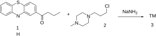 Butaperazine can be synthesized starting from 2-butyrylphenothiazine (1).[3] It is prepared in a manner that is comparable to the method used in the synthesis of propiomazine and propiopromazine. The phenothiazine is alkylated with 1-(γ-chloropropyl)-4-methylpiperazine (2), which is prepared in the conventional way by alkylating 1-methylpiperazine with 1-bromo-3-chloropropane.