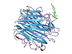 The C1q domain is a conserved protein domain. C1q is a subunit of the C1 enzyme complex that activates the serum complement system. C1q comprises 6 A, 6 B and 6 C chains. These share the same topology, each possessing a small, globular C-terminal domain, a collagen-like Gly/Pro-rich central region, and a conserved C-terminal region, the C1q domain.[2] The C1q protein is produced in collagen-producing cells and shows sequence and structural similarity to collagens VIII and X.[3][4]