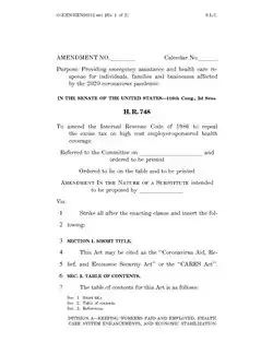 The original CARES Act proposal included $500 billion in direct payments to Americans, $208 billion in loans to major industry, and $300 billion in Small Business Administration loans.[7][8] As a result of bipartisan negotiations, the bill grew to $2 trillion in the version unanimously passed by the Senate on March 25, 2020.[9][10] It was passed by the House via voice vote the next day, and was signed into law by President Donald Trump on March 27. It was originally introduced in the U.S. Congress on January 24, 2019, as H.R. 748 (Middle Class Health Benefits Tax Repeal Act of 2019).[a] To comply with the Origination Clause of the Constitution,[11] the Senate then used H.R. 748 as a shell bill for the CARES Act,[12] changing the content of the bill and renaming it before passing it.[13]