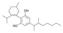 Another closely analogous compound has also been described, with the double bond in the cyclohexene ring shifted to between the 1,6-positions rather than the 2,3-positions (i.e. analogous to synthetic THC analogues such as parahexyl), the isopropenyl group saturated to isopropyl, and a 1,2-dimethylheptyl side chain. It is synthesized by Birch reduction from the 1,2-dimethylheptyl analogue of cannabidiol. This compound also produces potent cannabinoid-like effects in animals, but has three chiral centers and is composed of a mixture of eight stereoisomers, which have not been studied individually, so it is not known which stereoisomers are active.[7][8]