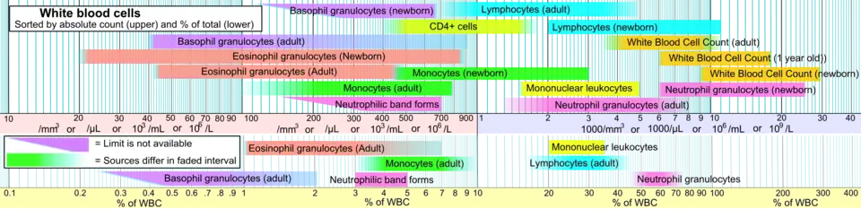 - ↑ Bofill M, Janossy G, Lee CA, MacDonald-Burns D, Phillips AN, Sabin C, et al. (May 1992). "Laboratory control values for CD4 and CD8 T lymphocytes. Implications for HIV-1 diagnosis". Clinical and Experimental Immunology. 88 (2): 243–252. doi:10.1111/j.1365-2249.1992.tb03068.x. PMC 1554313. PMID 1349272.