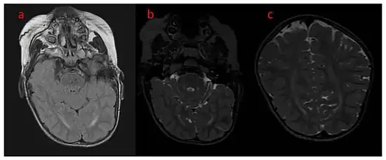 a–c) Brain MRI, T2 FLAIR , and coronal show unfinished myelinisation of white matter surrounding occipital horns.