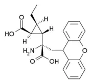 - ↑ Sørensen US, Bleisch TJ, Kingston AE, Wright RA, Johnson BG, Schoepp DD, Ornstein PL (January 2003). "Synthesis and structure-activity relationship studies of novel 2-diarylethyl substituted (2-carboxycycloprop-1-yl)glycines as high-affinity group II metabotropic glutamate receptor ligands". Bioorganic & Medicinal Chemistry. 11 (2): 197–205. doi:10.1016/S0968-0896(02)00387-5. PMID 12470714.