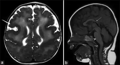 Magnetic resonance imaging of the brain shows abnormalities of the corpus callosum and cortical dysplasia, with pachygyria and polymicrogyria.