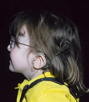 | "Lop ear" phenotype characteristic of a person with CHARGE syndrome, along with her cochlear implant. | |