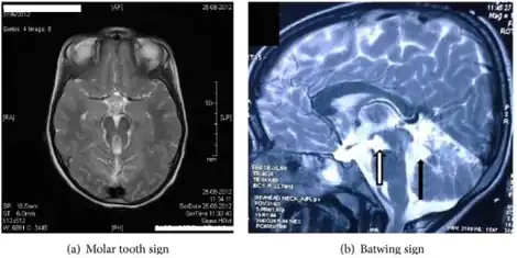a) Hypoplastic superior cerebellar peduncles form “molar tooth appearance.” b) “batwing appearance” in fourth ventricle.