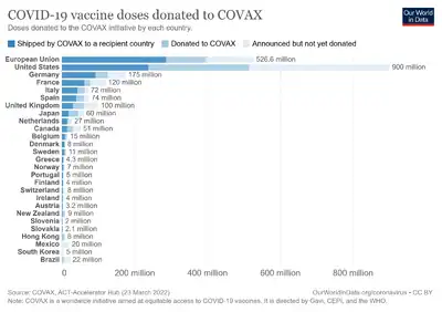 The United Kingdom has provided £548 million to Covax.[65] The United Kingdom was the biggest single donor to COVAX-AMC until being overtaken by the European Union and the United States.[66]