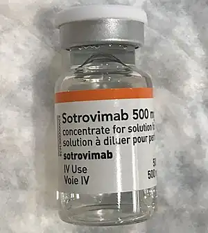 Sotrovimab, sold under the brand name Xevudy, is a human neutralizing monoclonal antibody with activity against severe acute respiratory syndrome coronavirus 2, known as SARS-CoV-2.[107][108][109] It was developed by GlaxoSmithKline and Vir Biotechnology, Inc.[108][110] Sotrovimab is designed to attach to the spike protein of SARS-CoV-2.[108][109][111]