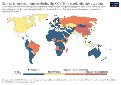 Due to the COVID-19 pandemic, a number of non-pharmaceutical interventions colloquially known as lockdowns (encompassing stay-at-home orders, curfews, quarantines, cordons sanitaires and similar societal restrictions) have been implemented in numerous countries and territories around the world. These restrictions were established with the intention to reduce the spread of SARS-CoV-2, the virus that causes COVID-19.[1] By April 2020, about half of the world's population was under some form of lockdown, with more than 3.9 billion people in more than 90 countries or territories having been asked or ordered to stay at home by their governments.[2] Although similar disease control measures have been used for hundreds of years, the scale of those implemented in the 2020s is thought to be unprecedented.[3]