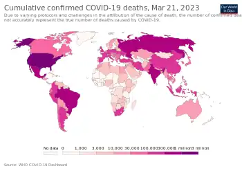 - ↑ World map of cumulative confirmed COVID-19 deaths by country. From Our World in Data.