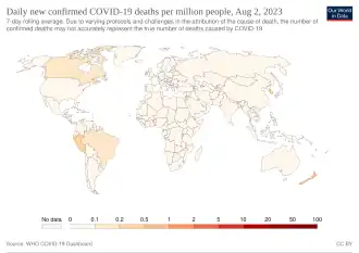 - ↑ World map of daily new confirmed COVID-19 deaths per million people by country. From Our World in Data.The chart tab has a timeline graph of worldwide daily new deaths per million people. Drag the timeline for numbers by date.