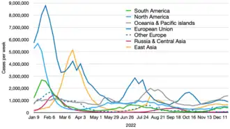 - ↑ "Timeline of weekly new confirmed COVID-19 deaths worldwide". Our World in Data. COVID-19 Data Explorer. The map and table tabs have exact numbers by country. Drag the table timeline for country numbers by date. The graph at the source is interactive and provides more detail by date.