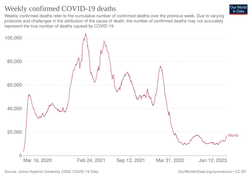 | Graph of weekly count of new confirmed deaths worldwide[17][note 2][note 3] |
