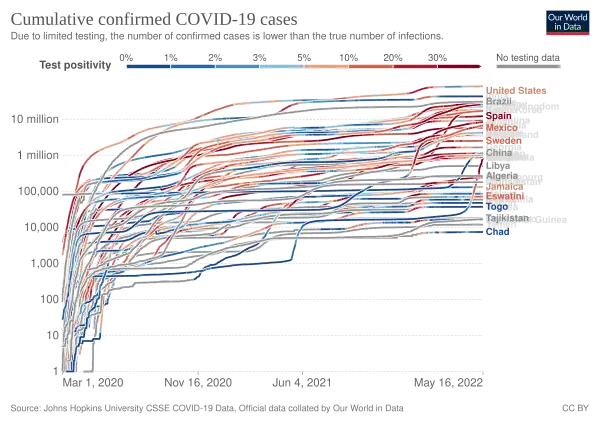 - ↑ World map of total cumulative confirmed COVID-19 cases by country. From Our World in Data.