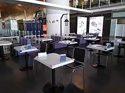![]() Tables arranged for social distancing at Beijing Capital International Airport in March 2020 | |