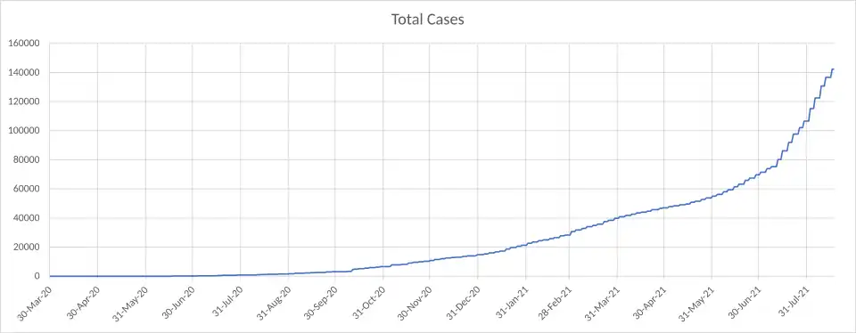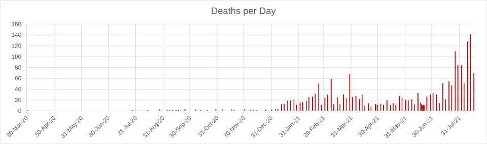 On 23 July the number of confirmed cases increased to 102124 (excluding those transferred to other countries). The death toll rose to 1485. Since the start of vaccinations on 26 March, 121518 persons had been fully vaccinated.[59]