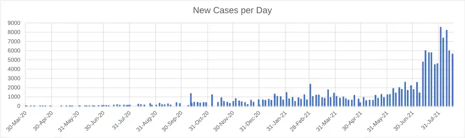 There were 172 new cases on 7 August, the highest number of infections announced in a single day so far. Three days later 148 new cases were reported, raising the total number of confirmed cases to 1214. A fatality was announced on 13 August, raising the death toll to three.[28] The same day 94 new cases were reported, of which 67 were citizens and 27 were foreign nationals.[29] The total number of confirmed cases rose to 1308.