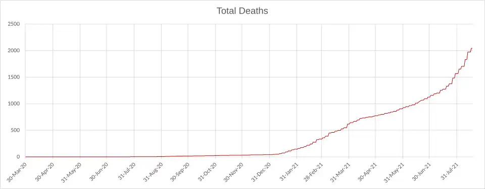 - ↑ "COVID-19 deaths at 202". Daily News. 11 February 2021. Archived from the original on 26 July 2024. Retrieved 13 February 2021.
