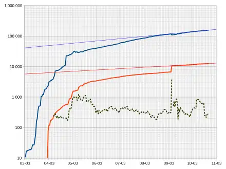 On the morning of 17 March, the Ecuadorian government confirmed a total of 111 positive cases.[35] The following day the Ecuadorian government confirmed a total of 155 positive cases.[36] increased to 168 positive cases in the afternoon.[37] The number of confirmed cases increased daily,[38] by the morning of 20 March, the number of confirmed cases had increased to 367, with 582 suspected cases, 5 deaths and 4 recoveries.[39]