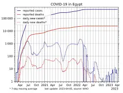 - ↑ "COVID-19 in Egypt: 949 new cases, 62 deaths reported on Tuesday". Egypt Independent. 1 December 2021. Retrieved 3 December 2021.
