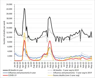 ![]() Office for National Statistics weekly COVID-19 deaths for England and Wales up to May 2022. | |