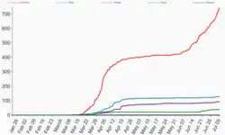 By May 12, 2020, 635 infections had been confirmed. 13% required hospitalization, and 574 (90%) were residents.[17]